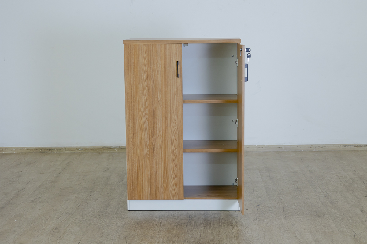 A Double Door Wooden Cabinet with a beautifully textured surface and robust structure. Equipped with 2 swinging wooden doors with 4 shelves for storage of books, files, and documents.