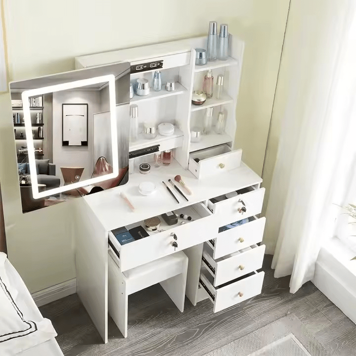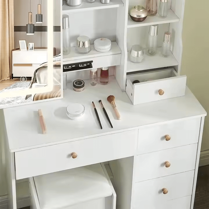 Spacious Design: Multiple drawers and open shelves provide organized storage for makeup, accessories, and grooming items.