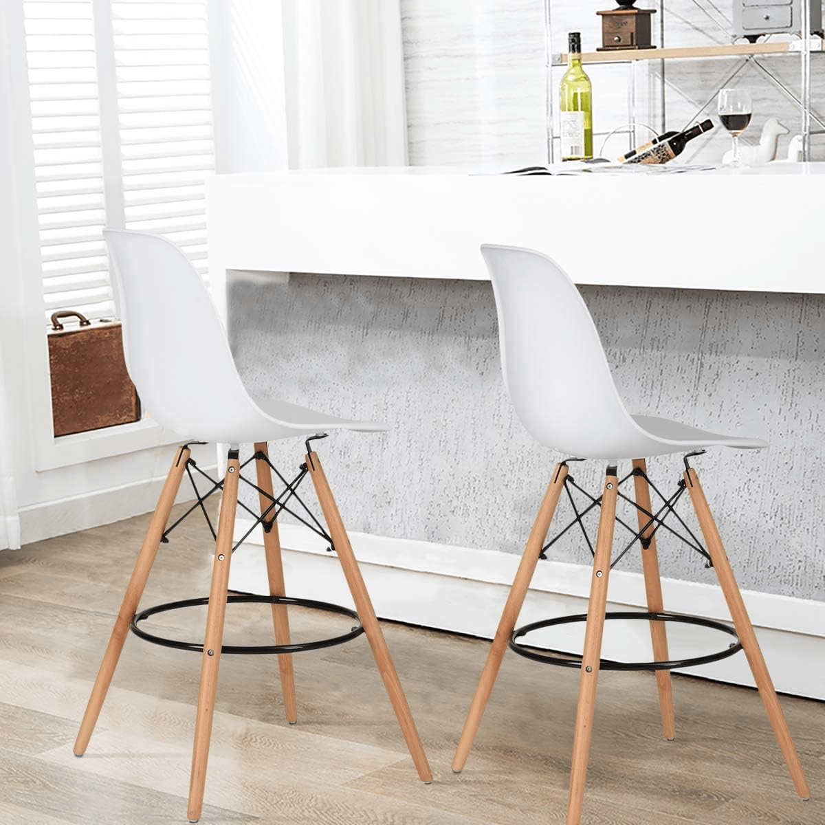 The ergonomic molded plastic seat provides comfortable support, making it ideal for extended seating. Its clean white finish adds a sleek and contemporary touch, effortlessly blending with a variety of interior styles. The elevated seating height makes it perfect for kitchen counters, breakfast bars, and high tables.